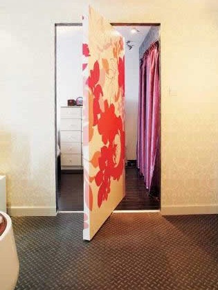 設計師劉東新為一對80后夫妻設計了一款彩繪旋轉門,巧妙地集功能性與時尚于一體。由于房間只有60平米,空間小,便用彩繪旋轉門把客廳和臥室巧妙隔開,墻壁和門合二為一,活動的彩繪門墻讓主人進出時,顯出“柳暗花明又一村”的意境。