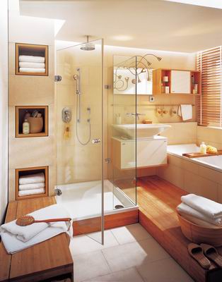 三要素定色屬于暖色系的紅、黃、橙,令人溫暖、喜悅,同時(shí)使空間感覺變小,而藍(lán)、綠等冷色系的顏色令人感覺寒冷、冷靜,使空間感覺較寬敞;另外,彩度及明度較高的色彩可塑造空間的寬敞,反之則使空間有穩(wěn)重感。除了色彩本身,照明效果就象色彩的“魔術(shù)師”,相同的顏色常因不同的光線亮度,在視覺上產(chǎn)生差異。因此,為衛(wèi)生間選擇色調(diào)前,應(yīng)綜合考慮以上三要素。