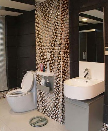 這是一個很小的衛(wèi)生間,加起來面積大約5平方米。整體以暗色調(diào)為主,為了保證干濕分離,淋浴間部分與其他部分之間加了一道鋼化玻璃幕墻,把功能區(qū)劃分得清清楚楚。