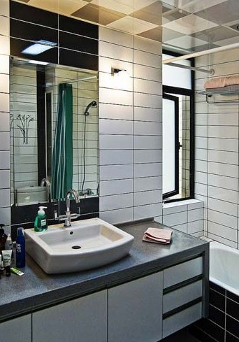 與淋浴間相對的墻面完全使用了鏡子,擴大了小浴室的空間視覺感,鏡子前面做成了浴室架,上面安裝了臺式盆,這里可以梳洗打扮,邊上的綠色植物,成了整體設計中引人注目的亮點,也為環(huán)境帶來了生氣。