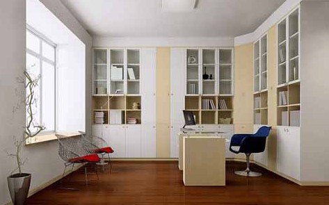面積不是很大的書房,沿墻以整組書柜為背景,前面配上別致的寫字臺,全部的家具以淺色調(diào)為主,體現(xiàn)書房的靈敏感和進(jìn)取感。面積稍大的書房,則可以用高低變化的書柜作為書房的主調(diào)。