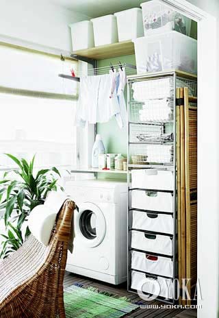 在決定怎么放置你的雜物之前,不妨提前做一個(gè)簡(jiǎn)單的規(guī)劃,畫一張草圖,先分配好洗衣機(jī)、晾衣架等不能隨意移動(dòng)的大件物品的位置,然后再分別安置可移動(dòng)的小物件。洗滌劑、洗衣籃之類常用物品放在方便取用的地方,另外一些很少使用的雜物則可以放在密閉式儲(chǔ)物盒中,利于保存。