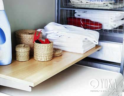 可以自由升降、調(diào)節(jié)高度的托架和擱板是洗衣區(qū)必備的收納法寶。擱板下放洗衣機(jī),擱板上則可以擺放一些陽(yáng)臺(tái)晾曬小工具。