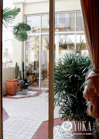 面積較大的室外陽(yáng)臺(tái)鋪地材料可以豐富一些,整體瓷磚搭配局部卵石,營(yíng)造天然趣味,植物也可以用一些形體較高大的,比如棕櫚。