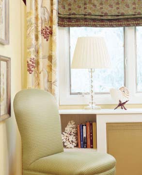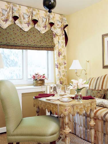 設(shè)計師通過一張沙發(fā)的圖案改變了整個餐廳的布置,條紋沙發(fā)雖然色彩豐富,但顏色略顯暗淡,于是,他將羅馬簾用亮麗的水果圖案來裝飾,并搭配了層疊的窗簾來強(qiáng)調(diào)層次,同時在色彩上也與羅馬簾呼應(yīng)。通過大量的布藝和精美的家具來裝扮出了一間不大但典雅的餐廳。