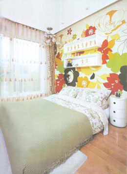 用鮮艷的大花圖案鋪滿整個墻面是需要設計水平的?;ǘ渌玫念伾珣摽刂圃谙嘟纳壬希挪伙@得繁亂。在大件家具上運用白色降低墻面顏色的飽滿度,在小件飾品上運用類似的圖案來呼應墻面圖案,成為這間居室的一大亮點。