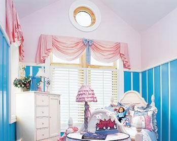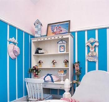 兒童房的裝飾重點(diǎn)應(yīng)該是表現(xiàn)孩子的天真活潑,在藍(lán)白相間的條紋墻裙上加入柔美的粉紅色,整個房間立刻變得溫馨可愛。床上用品、桌布和窗簾的各個細(xì)節(jié)搭配與墻面的顏色非常統(tǒng)一,更讓這小小的空間成為一絲不茍的完美境界。