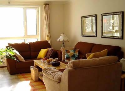 客廳是家中最寬敞明亮的空間了,色調(diào)沿用了整個房屋所采用的中性暖色系。墻漆是淡淡的粉橙色,頂是乳白色,門也是乳白色。除了門廳的主題墻,我家所有墻漆都是來威漆,顏色正,亞光的質(zhì)感也不錯,后來我才知道,宜家的樣板間也全部用這個牌子的漆。整個客廳的用色曾被我形容為“牛奶+咖啡”,用在沙發(fā)上是最貼切的。沙發(fā)是北京的老品牌宏遠(yuǎn)山水,很墩實(shí)耐用,具有美式風(fēng)格典型的寬大舒適,靠背比一般沙發(fā)要高,老公最喜歡這種坐上就陷進(jìn)去的感覺,款式是他拍的板。茶幾和沙發(fā)邊桌是在建材超市選的質(zhì)量好的集成材,木工師傅根據(jù)我的要求打制的,本想要個方形的,可沒有寬度合適的集成材,留下了一點(diǎn)遺憾。