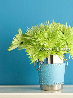做法:在這只桶上面裝飾上有三維銀色小圓點的皮革帶子。用這樣的方式,簡單的花瓶儼然是一件出眾的家居裝飾品了。