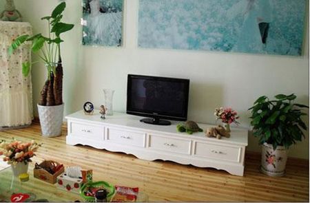 客廳里最大件家具就是電視柜了,先發(fā)張電視柜的特寫鏡頭,制作它最難的部分就是設(shè)計了,既要田園風又要實用還要獨具特色,本想以彩繪取勝,但是電視背景墻的婚紗照已經(jīng)花色圖案太多,電視柜再彩繪,整體看上去就太繁復(fù)了,最終還是以優(yōu)雅的外形線條來標新立異!電視柜設(shè)計制作成 兩米四的長度單層四個鑲邊立體抽屜外形附帶滑槽 加底部和側(cè)面的弧形裝飾線條突出了法式田園風的優(yōu)雅和注重細節(jié)的修飾!