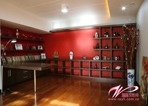 寬敞的會(huì)客區(qū),也是陳列區(qū),木質(zhì)擱架,讓整體空間有一種沉穩(wěn)的感覺(jué)。