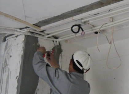 頂面的電線施工已經(jīng)基本完成,而為了保證電工程的質(zhì)量,電工師傅正仔細(xì)的對線頭逐個檢查。并將一些管線用膠帶扎在一起,保證吊頂內(nèi)部空間整潔。