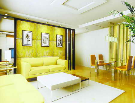 本案主人崇尚質(zhì)樸、單純的生活方式,因此設(shè)計(jì)風(fēng)格定位為簡約、自然、充滿濃濃的生活味。裝飾手法上不存在雕琢的痕跡,以塊面、線條等形式尋求視覺上的統(tǒng)一,在自然色系中體現(xiàn)高貴品質(zhì),讓質(zhì)樸、自然之風(fēng)縈繞在空間的每個(gè)角落。明艷的黃色令空間彌漫了嬌嫩的色澤,配上皮革天然的質(zhì)感,使整體含蓄而儒雅。背景墻面上黑色的裝飾花紋讓輕柔中多了些華貴之氣,像滿壁的向日葵花在熱烈綻放,心情也隨之明快起來。素色的掛畫把房間裝飾得穩(wěn)重而小巧,又不失人文之氣。玻璃家具從材質(zhì)中折射出光線,加上臺燈的點(diǎn)綴,令空間更多了些層次和變化。白色與黃色在一起搭配讓人感覺年輕的光芒,乳白的茶幾、乳白的地毯,靜謐而雅致,激起主人無限遐想。