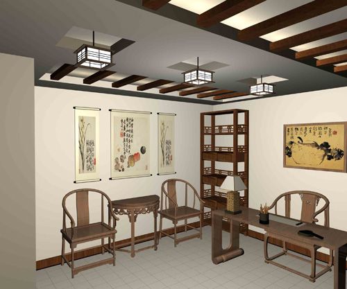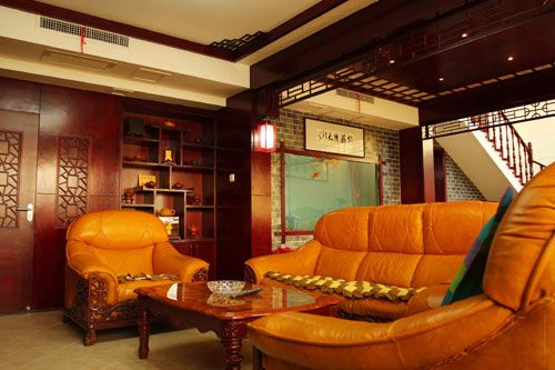 深色家具往往使人感覺到壓抑,可是這款深色的紅木家具與青色的瓷磚搭配卻讓人眼前一亮:青色的瓷磚在墻面和地面起到了不同的裝飾效果,置身其中,總有一種揮毫潑墨、飲酒作詩的雅興。
