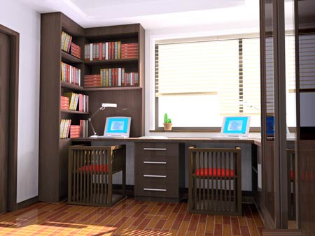 無(wú)論書(shū)桌與電腦臺(tái)是否連接,“L”形的臺(tái)面是最適合工作與上網(wǎng)的工作臺(tái)首選方案。臺(tái)面下一定要有一個(gè)足夠大的鍵盤(pán)架,最好能放得下鼠標(biāo),為了能讓雙足有充分的伸展空間,臺(tái)面下能空則空,最多加一個(gè)小推柜即可。如果有空間,在電腦臺(tái)旁擺放一個(gè)半高的小文件柜或書(shū)架,或是在工作臺(tái)的墻面上搭幾塊隔板,就會(huì)讓文件、書(shū)籍、光盤(pán)的拿取變得輕而易舉。