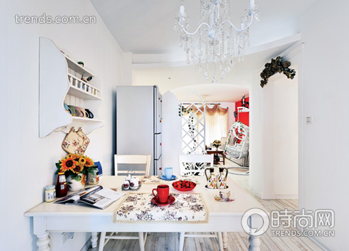 走進雅婧的家,白色所營造的清新氣息撲面而來。S形墻面及吊頂連接客廳與餐廳,并為這兩個區(qū)域做了自然劃分,完美的曲線造型,打破了原來客廳過道的呆板,讓整個空間靈動起來。雅婧偏好田園風,可田園做到極致,常常是繁復的,這不是她所想要的。最后設計師決定以白色打底,仿舊淺灰的地板奠定空間的明**。墻面沒有采用慣有的壁紙做法,整個空間顯得干凈利落,后期則用裝飾物來改善空間,增加溫馨的感覺。