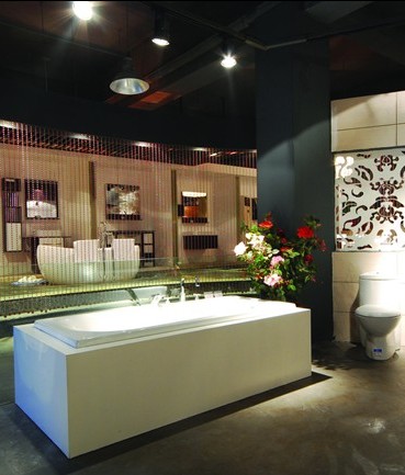 黑色、紫色,花卉,一派自然中繁榮的景象,把它們運(yùn)用在衛(wèi)生間中也一樣溫馨,再配上幾只紅白色花卉和帶有神秘感的紫色線(xiàn)簾,更顯得素雅、別致。
