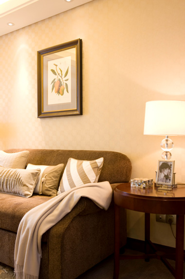 客廳空間小,設(shè)計師選擇淺色,冷色調(diào)的墻紙,來創(chuàng)造一種寬敞、雅致的視覺效果。配上素凈不張揚的壁畫,給了客廳幾分情調(diào)。米黃色的燈光,讓房間披上了一間溫馨的外衣,讓來客感受到主人的真誠。淺咖色的靠墊與柔軟的羊毛毯更添了幾分舒適。邊幾上用黑貝母裝飾盒和相框做裝飾來凸顯主人的品味。