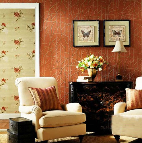 布藝:單是一面墻壁使用了壁紙,自然會顯得很突兀。注意在靠包和腳凳等小面積的面料選擇方面與之相呼應。布料的花型比例大小應與壁紙相當,在顏色方面也要保持一致。