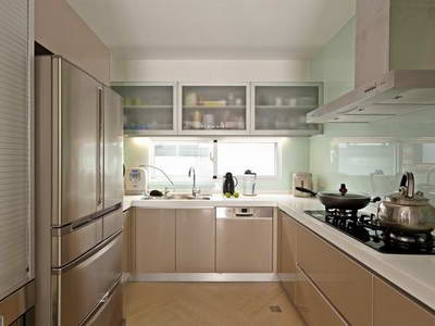 ?。ⅷ牵⑿偷膹N房強(qiáng)化收納功能及使用動(dòng)線,選用了方便清理的仿木紋地磚,搭配溫暖色系廚具。這個(gè)廚房的主婦很具巧手。