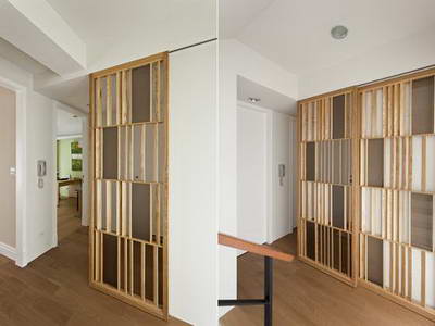 樓梯間以兩片木作移動(dòng)式屏風(fēng)巧妙遮擋了廁所門,木制的線條有特殊的景致。既增加了空間美感,又讓整體設(shè)計(jì)更上一個(gè)層次。