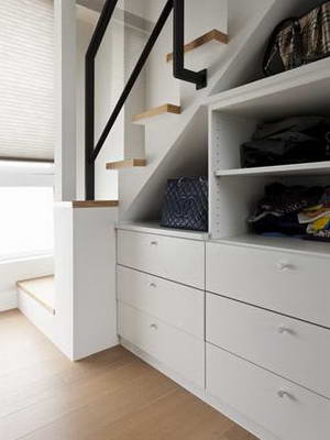 本案例開始的時(shí)候就強(qiáng)調(diào)過,這套房子的收納值得多種戶型借鑒。這雖然只是一個(gè)樓梯下方則做成了一個(gè)展示及收納柜,閑散空間得到絕佳利用。