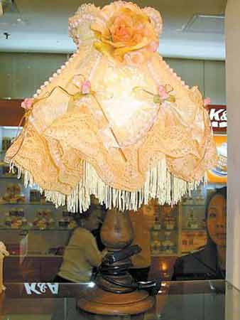 在某布藝店內(nèi),擺滿了蕾絲紗或蕾絲布的窗簾、可愛(ài)的洋娃娃、色彩豐富的臺(tái)燈飾品,還有各式各樣的玩藝兒,像西式燈、籃子、儲(chǔ)物箱……給人帶來(lái)浪漫和驚喜。在家中玄關(guān)處擺放一面蕾絲花邊的鏡子,出門前梳理整齊,既美觀又實(shí)用??茨莻€(gè)披上外衣的化妝盒在嬌滴滴地向你撒嬌。有蕾絲花邊的燈飾體現(xiàn)華麗風(fēng)情,最適合在客廳擺放,尤其是搭配布藝的沙發(fā)。這里的蕾絲西式燈罩都是精工制作,每件都好像在量身定做宮廷禮服,直立的燈飾也好似正要參加宮廷舞會(huì)的貴族,這樣的燈飾為客廳增色不少。