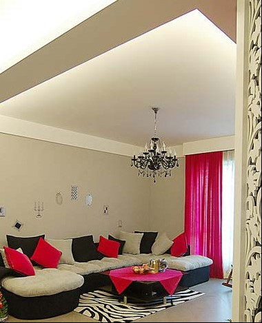 將有限的空間渲染得那么嫵媚——玫紅色的細(xì)節(jié)之美令人無法不心動(dòng)。此款沙發(fā)我最喜愛,黑、白、玫紅搭配,小方桌與小方塊黑白地毯以及頭頂上的吊燈都是相互呼應(yīng)的,整體看上去很舒適,一般小女人都會(huì)喜歡。枚紅色的窗簾生動(dòng)又協(xié)調(diào)。