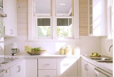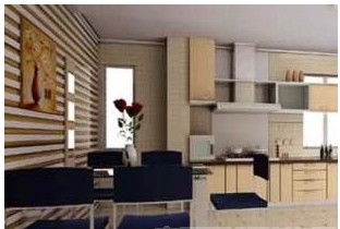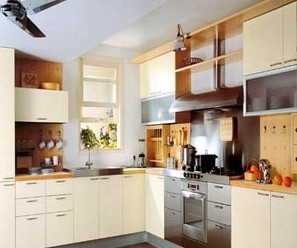 如今設計師的創(chuàng)意能將整個廚房都藏了起來:在一字形或L形櫥柜 兩側分別設計一個立式儲物柜,此柜 的四面能依次拉伸,組合成一扇長長的柜門,需要時,就可 將此四扇門向中間合攏,將中間的工作臺、吊柜和地柜都掩藏起來。