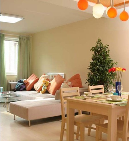 房間的顏色可以用一個詞形容“單調”。中性色彩是大多數(shù)臥室采用的——白色的主色調,如果其他的裝飾品如枕頭用玫瑰粉色,再加一點橙色,就會使色調更加亮麗,增添新婚的浪漫感覺。