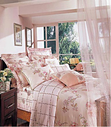 床也改變了顏色,粉色的加入改變了原來單調的白色,枕頭的圖案也與房間內其他的圖案相呼應。甚至是床罩邊的蕾絲也采用了大膽的粉色,配合整體的新婚氛圍。