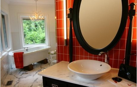 想走大膽的現(xiàn)代風嗎?只要一小片大紅的瓷磚墻就可以很輕易地吸引眾人的目光喔!掛上鮮紅浴巾,就更讓人忘不了啦!