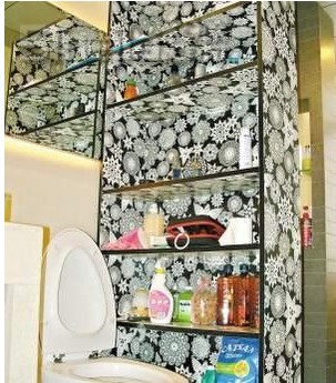 客廳的一側(cè)是電視背景墻,另一側(cè)則靠近一樓臥室和衛(wèi)生間。衛(wèi)生間的旁邊是通往二樓的樓梯,樓梯底下設有一個工人房。據(jù)介紹,樓梯對著餐桌本來也有一墻隔。同樣基于通透的考慮,這面墻也順利拆掉了,只簡單做了一個1米高的玻璃護欄??紤]到客廳的地板和天花都是白色系,沙發(fā)背后的墻全部鋪上紫金砂的天然大理石,在射燈的照耀下,閃爍著一種迷人的特殊光澤。在臨近沙發(fā)角幾的位置,獨辟一塊作為飾品櫥窗,銀色馬賽克與黑色形成高調(diào)的對比。