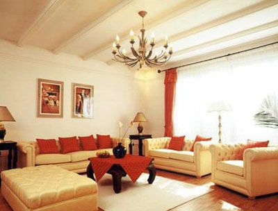 客廳的天花板和地板的設計要遵從“天輕地重”的原則,天花板的顏色要以淺淡為主,地板的顏色要相對深一些。如果上面顏色深,下面顏色淺,就會給人頭重腳輕的感覺。天花板若有橫梁,人坐在橫梁下容易造成精神緊張,要用一些美觀藝術的方式把橫梁巧妙地隱藏起來。