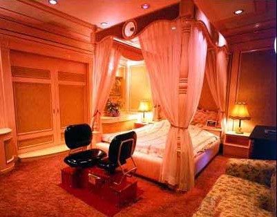 在洞房的四壁及天花板上,噴涂七彩墻飾涂料,以抽象、朦朧為基調(diào),造成一種如夢似幻的神秘遐想效果,使新婚蜜月充滿浪漫氣息。