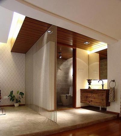 這款衛(wèi)生間設(shè)計(jì)非常大膽,本來(lái)是想做半敞開(kāi)式,后來(lái)經(jīng)過(guò)修改,將馬桶單獨(dú)隔了一起來(lái),將洗手臺(tái)放在外面,類(lèi)似公共場(chǎng)合。由于相連的空間是游戲室,還擺放了一張麻將臺(tái)子、為了整理美觀考慮,在這間加了一道從頂而下的簾子,絲毫沒(méi)有突兀的感覺(jué)。