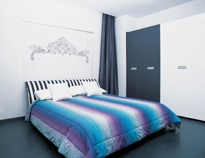 黑白色調(diào)搭配的臥室看似簡(jiǎn)單,細(xì)節(jié)處的處理頗具匠心。白墻、白色靠包、白色壁畫(huà),大面積的黑白色調(diào)創(chuàng)造出整體空間的冷酷美感。而黑門(mén)、黑色地板、黑色窗簾更加映襯出白色的純凈 ,黑白色調(diào)相映成趣,在藍(lán)紫色床品的柔化下,使人感受到房間的憂郁情緒。