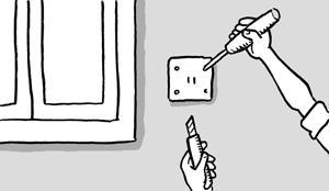 在處理電燈開關(guān)與插座周邊位置時,先關(guān)掉電源,以正常方式貼平壁紙,覆蓋過這些地方,然后再將蓋過開關(guān)與插座部位的壁紙自中央向四個角落切開。接著松開螺絲,以切開部位的紙緣折入蓋內(nèi),再裁掉多余的部分即可。