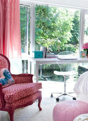 5、一款古典的扶手椅被漆上了漂亮的紅色油漆,并且用動物斑紋來裝飾,給這個女孩房增添了生動的色彩。