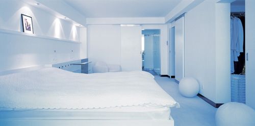 這是一間偌大的一色潔白的房間,白色的四壁,白色的床榻,白色的沙發(fā),白色的地毯盡管想到白色便會想到純潔,但白色同時也會給人以冷漠,拒絕,高不可攀的印象。現在它不再是簡單的純潔,當一襲黑衣的主人坐臥在寬大的床榻上時,白色是性感的。在一身休閑的主人與朋友傾心交流的時候,它不再是拒絕的色彩,白色是溫情的,此刻單一的白色被賦予了豐富的感情。