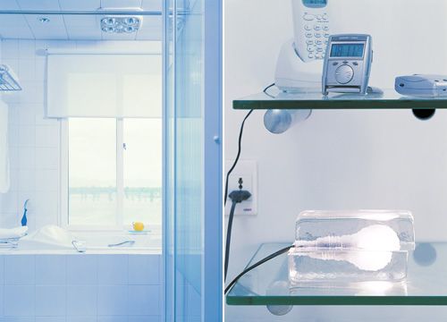 包裹在冰塊中的臺燈,白熾的柔光穿透冰層;托盤中靜靜佇立的四支蠟燭,承托著流著淚的燭花;一排灰白黑色調的照片,里面有誘惑的美女,有滄桑的老人,當然還有令胡媽媽自豪的兩個兒子,只是他們都是含蓄的一個身影,相框統(tǒng)一而內容豐富。這樣的亮點在每一個房間默默地散發(fā)著誘人的光彩。