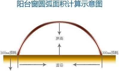 圓弧窗面積=(直徑+拱高+600mm損耗)×窗洞高度