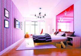 大花圖案目前引用在室內(nèi)裝飾中有幾種,一種是噴繪、手繪,手繪效果最好,但造價(jià)較高,很多人接受不了。而噴繪造價(jià)低一些,但可能沒有手繪那么有靈性。整個(gè)房間使用大花圖案時(shí)一定要注意,房間要夠大,花色要夠素,否則容易給人很燥很亂的感覺。