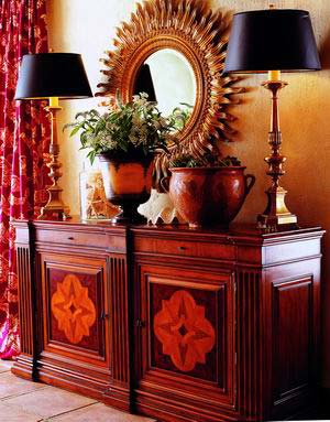 并不是簡單的對(duì)傳統(tǒng)文化的復(fù)古,而是在現(xiàn)代裝修風(fēng)格中融入古典元素,尤其流行將傳統(tǒng)家具原始功能進(jìn)行演變,比如把雙人床榻用來做沙發(fā)等;有的家具看似是普通的現(xiàn)代風(fēng)格,但由于在板材上包裹了紋理畢現(xiàn)的皮革,而彌漫著雍容華貴的古典氣息。局部夸張的造型、仿鱷魚皮等頹廢奢華的材質(zhì)和濃烈的純金屬色以及對(duì)抽象化幾何線條裝飾的偏愛,都讓這種’不倫’的古典風(fēng)潮再度溫暖我們的居室。