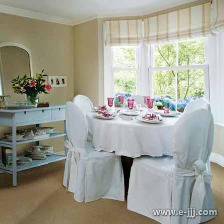 設計簡約的窗戶,讓飯廳的光線十分充足,椅子上裝飾著潔白漂亮的套子,十分舒適,旁邊簡單的藍色儲物架讓這里充滿濃濃的田園氣息。