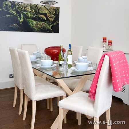 桌上的玻璃制品和白色織物裝飾的椅子,讓這個小小的區(qū)域很明亮。桌子中央用了暗紅色的花瓶來裝飾,墻上掛著一副巨幅風景畫,是不是也很有一番趣味呢!