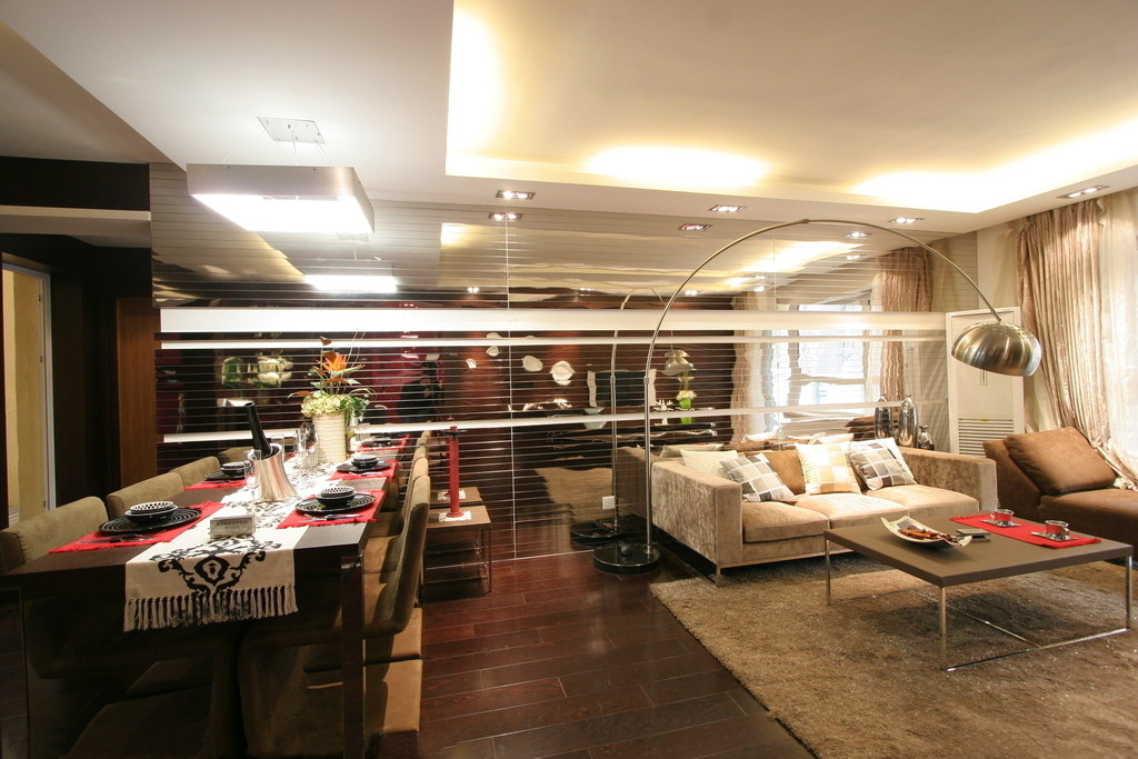 概要: 兩室兩廳的戶型在很多樓盤里面都充當(dāng)著主打?! ∵@是客廳跟餐廳的全景圖,具以現(xiàn)代風(fēng)格為主題。沙發(fā)同餐椅為棕色系,客廳大塊的棕色短毛地毯 配以深咖的實(shí)木板,造型簡(jiǎn)潔的茶幾,U型落地?zé)?。中?guó)紅的餐墊是這里軟裝飾的亮點(diǎn),讓現(xiàn)代感更具中國(guó)特色。 站在臥室門口看客廳全景。雖然采取開放式的,但是絲豪沒有影響空間的美感。為了區(qū)別,客廳及餐廳采取不同的吊頂。