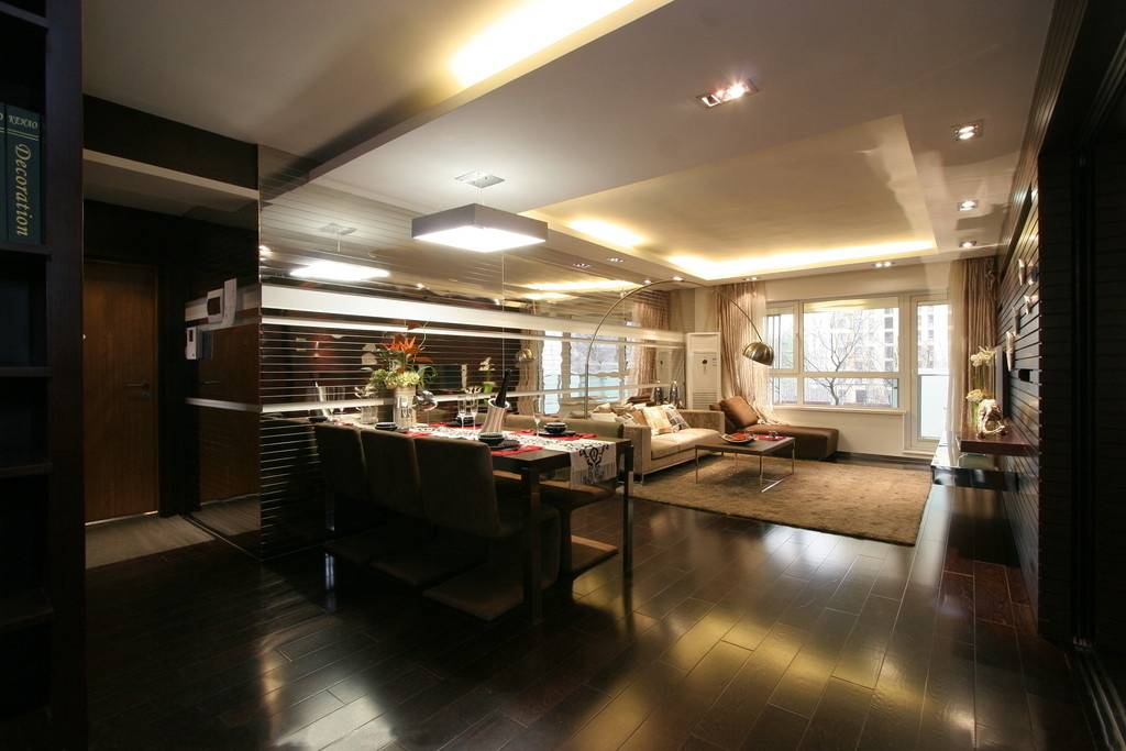 這是客廳跟餐廳的全景圖,具以現(xiàn)代風(fēng)格為主題。沙發(fā)同餐椅為棕色系,客廳大塊的棕色短毛地毯 配以深咖的實(shí)木板,造型簡(jiǎn)潔的茶幾,U型落地?zé)?。中?guó)紅的餐墊是這里軟裝飾的亮點(diǎn),讓現(xiàn)代感更具中國(guó)特色。