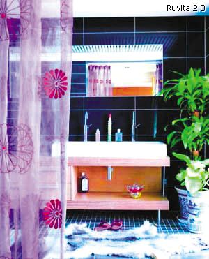 手工刺繡的雛菊圖案在紫紗上若隱若現,不可捉摸。試著在浴室干濕過渡區(qū)域配上輕盈淡紫色紗幔,既分割區(qū)域又讓浴室的空氣通透舒適。大片的綠葉豐富了黑色瓷磚的層次,給浴室?guī)砹藷o限的生機。