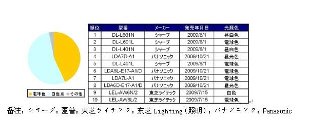 暢銷(xiāo)結(jié)構(gòu)方面,則大體上呈現(xiàn)出電球色及白色系平分秋色的態(tài)勢(shì)。其中電球色燈泡銷(xiāo)量約占43%,白色則約占54%。品牌方面,夏普DL-601N、601L、L401N三款產(chǎn)品分別位居暢銷(xiāo)榜第1~3位;DL-L401L位居第5位。Panasonic公司LDA7D-A1(第4位)、LDA7L-A1(第7位)等4款產(chǎn)品名列前10。東芝照明LEL-AW6N/2、LEL-AW6L/2則名列第9、10名。
